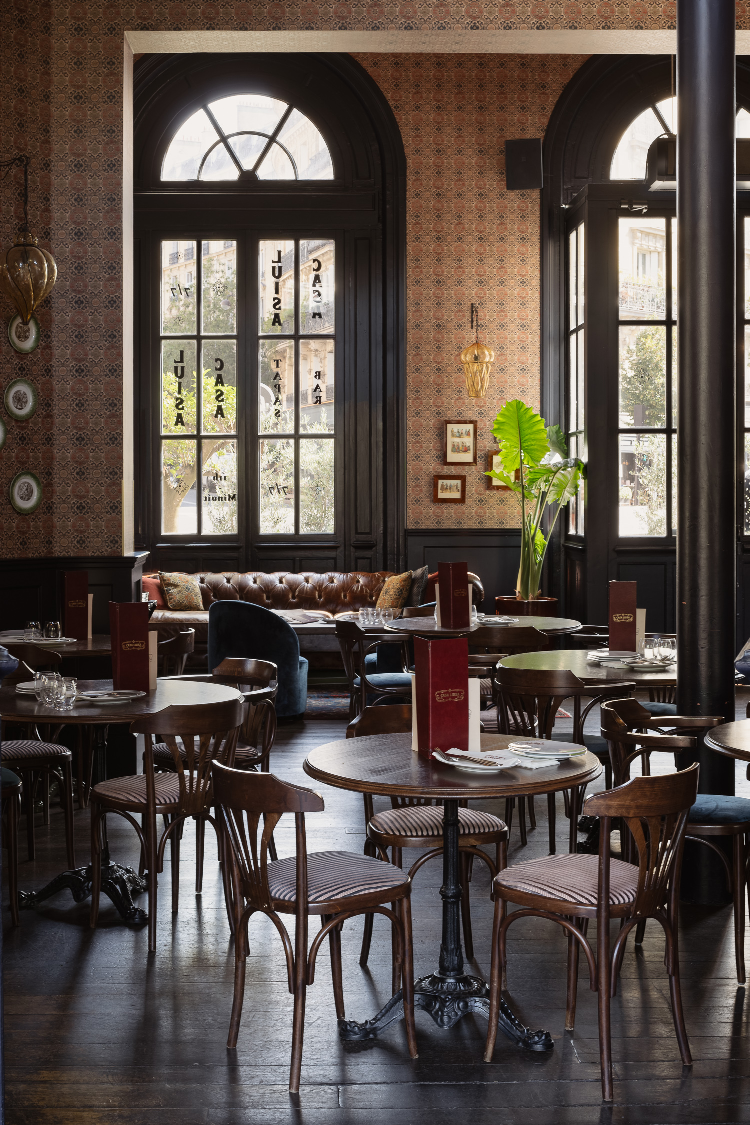 La scénographe a repatiné le plancher en redonnant vie au chêne d’origine, installé de théâtraux rideaux en velours Médicis, accentué les dessins des huisseries de noir et d’acier… Tout en y invitant l’Espagne à table ou au bar: un tableau de Louisa tombé d’un vieux grenier, des assiettes de Don Quichotte, le papier peint mauresque d’Iksel… et les dégradés Terre de Sienne qui rappellent les ocres des collines de Castille.